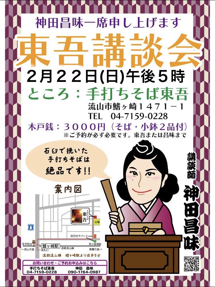 | 2月22日(土) | 「東吾講談会」 開演17:00 講談終演後食事 会費:3000円 そば、小鉢2品付き 場所:手打ちそば 東吾 流山市鰭ヶ崎1471-1 流山線鰭ヶ崎駅より徒歩5分 問合せ:0471-59-0228 *20名様限定 完全予約制です。 美味しい手打ちそばの味と昌味の講談の味のコラボ、是非お越し下さい。 | |