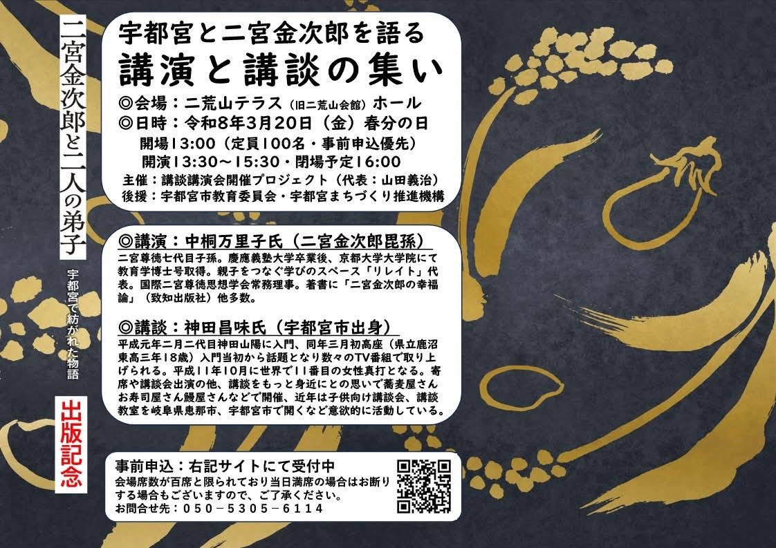 | 3月20日(金) | 「宇都宮と二宮金次郎を語る講演と講談の集い」<New> 開演13:00 場所:二荒山テラスホール(旧二荒山会館) 二宮家七代目にあたる中桐万里子氏の講演 事前申込(入場無料)はこちらから 問い合わせ050-5305-6114 ![]() |
